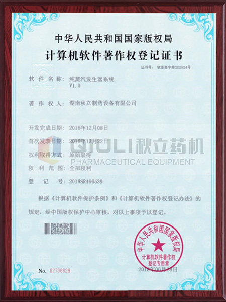 計算機軟件著作權證登記證書-純蒸汽發(fā)生器系統(tǒng)